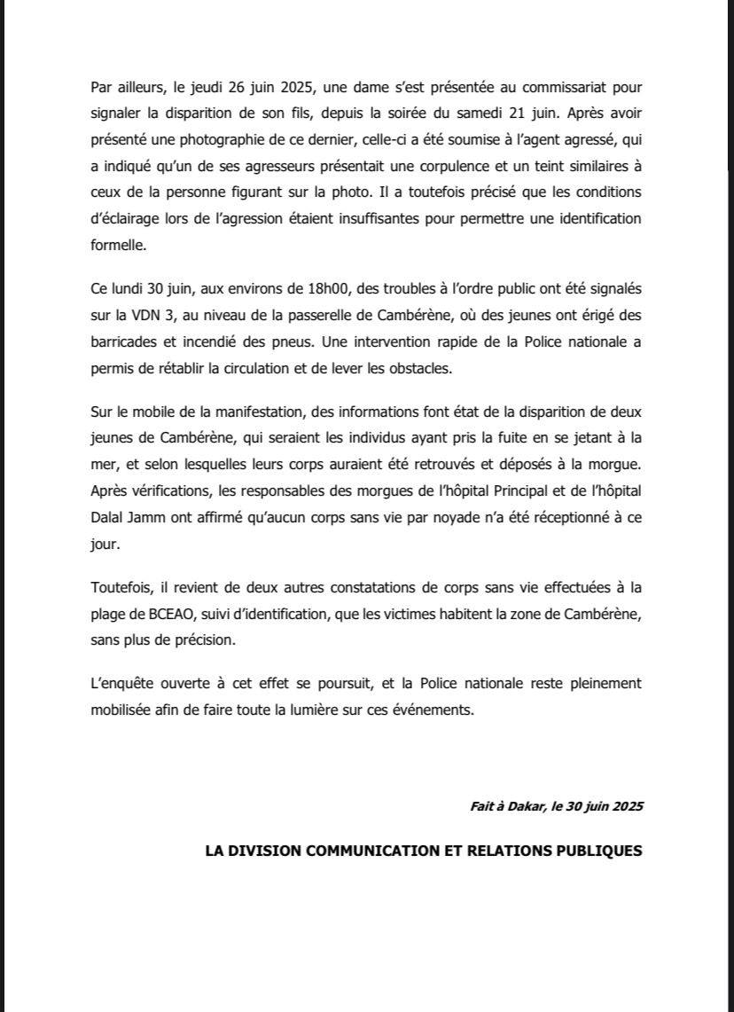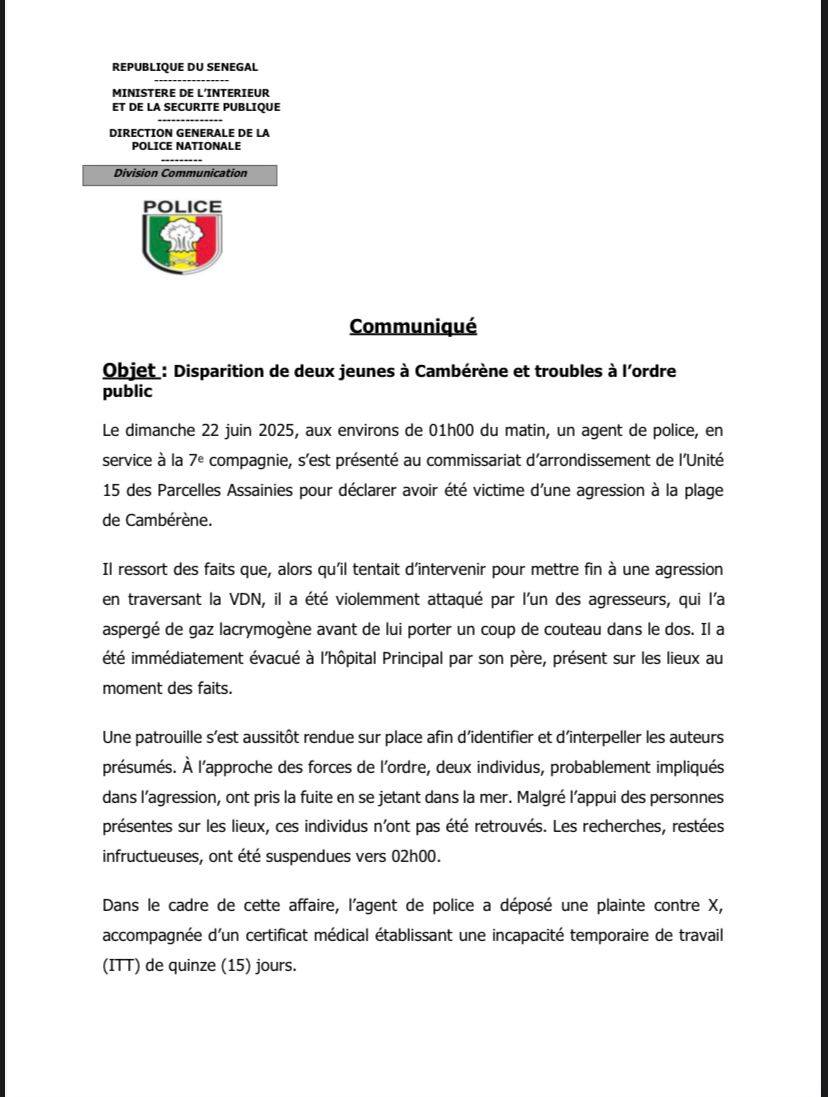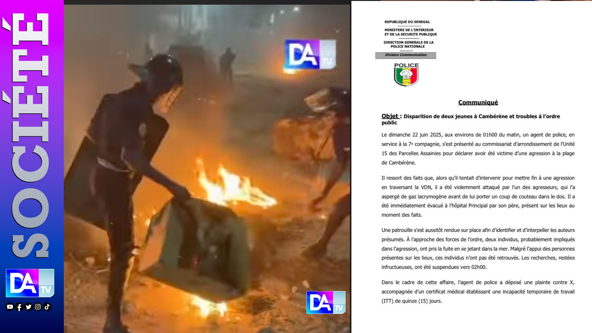 Une opération policière sur la plage de Cambérène se transforme en tragédie : un policier agressé, deux jeunes qui s'échappent en plongeant dans la mer, et depuis lors, un lourd silence plane sur leur destin. Tandis que la population attend des explications, la Police nationale présente sa perspective des événements.