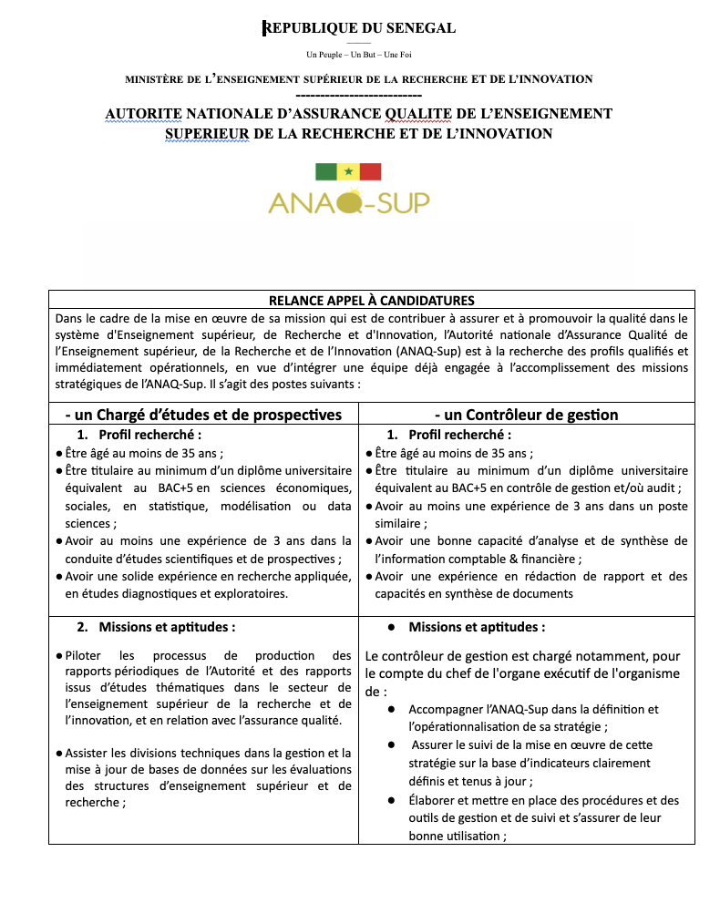 Dans le cadre de la mise en œuvre de sa mission qui est de contribuer à assurer et à promouvoir la qualité dans le système d'Enseignement supérieur, de Recherche et d'Innovation, l’Autorité nationale d’Assurance Qualité de l’Enseignement supérieur, de la Recherche et de l’Innovation (ANAQ-Sup) est à la recherche des profils qualifiés et immédiatement opérationnels, en vue d’intégrer une équipe déjà engagée à l’accomplissement des missions stratégiques de l’ANAQ-Sup. Il s’agit des postes suivants : (Document ci-dessous)