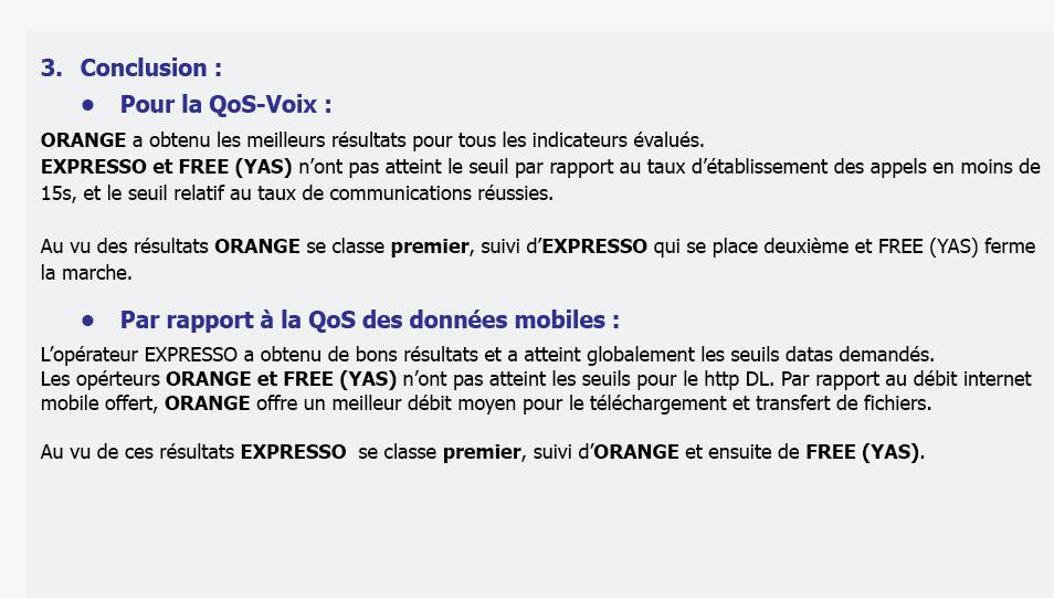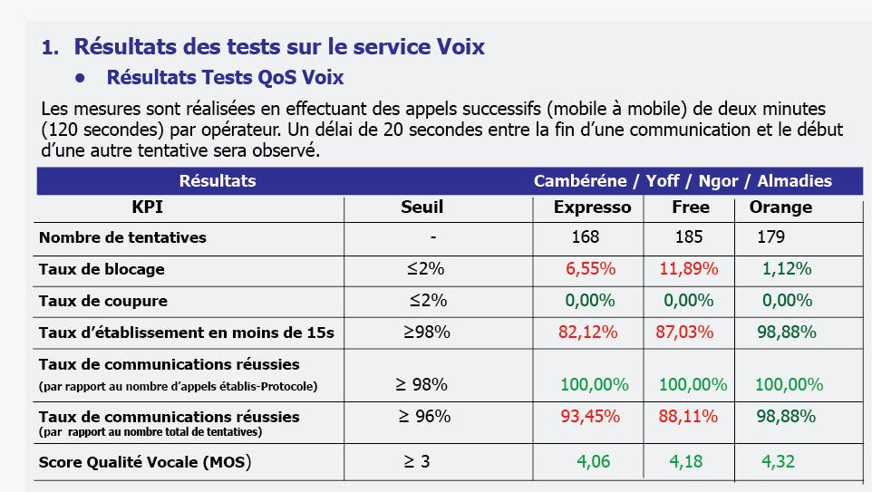 Orange a obtenu les meilleurs résultats pour tous les indicateurs vocaux, notamment le taux de blocage, le taux de coupure et le taux d'établissement des appels en moins de 15 secondes. Expresso et Free n'ont pas atteint les seuils pour le taux d'établissement des appels en moins de 15 secondes et le taux de communications réussies.