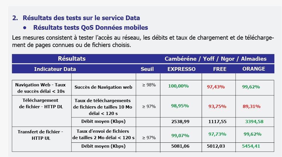 Expresso a atteint globalement les seuils pour les services de données mobiles. Orange et Free ont échoué au test de téléchargement de fichiers (HTTP DL).