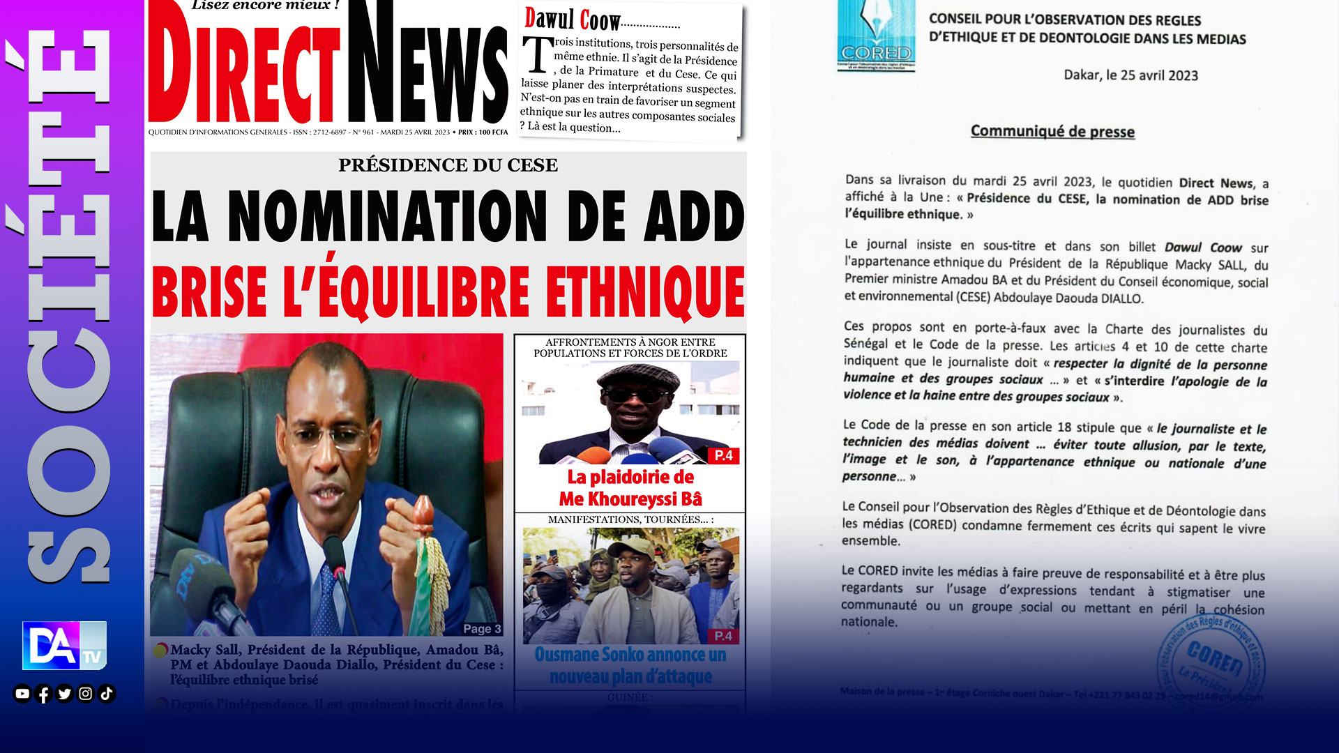 La parution du jour du quotidien Direct News a particulièrement attiré l’attention des acteurs de la presse. Le journal sur la nomination du nouveau président du Conseil économique, social et environnemental écrivait ce mardi à la Une : « Présidence du CESE : la nomination de ADD brise l'équilibre ethnique. » Un titre qui aura choqué le conseil pour l’observation des règles d’éthique et de déontologie dans les médias qui rappelle à l’ordre le quotidien « Direct News » à qui il reproche cette touche dans son billet « Dawul Coow » où il fait focus sur l'appartenance ethnique du Président de la République Macky Sall, du Premier ministre Amadou Ba et du Président du Conseil économique, social et environnemental (CESE), Abdoulaye Daouda Diallo. « Ces propos sont en porte-à-faux avec la Charte des journalistes du Sénégal et le Code de la presse qui indique que le journaliste doit « respecter la dignité de la personne humaine et des groupes sociaux ... » et « s'interdire l'apologie de la violence et la haine entre des groupes sociaux », précise le Cored.
