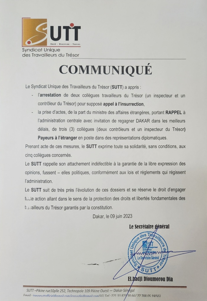 Dans un communiqué, le syndicat unique des travailleurs du trésor ( SUTT) dit avoir appris l'arrestation de deux de ses collègues dont un inspecteur et un contrôleur du trésor pour supposé appel à l'insurrection.