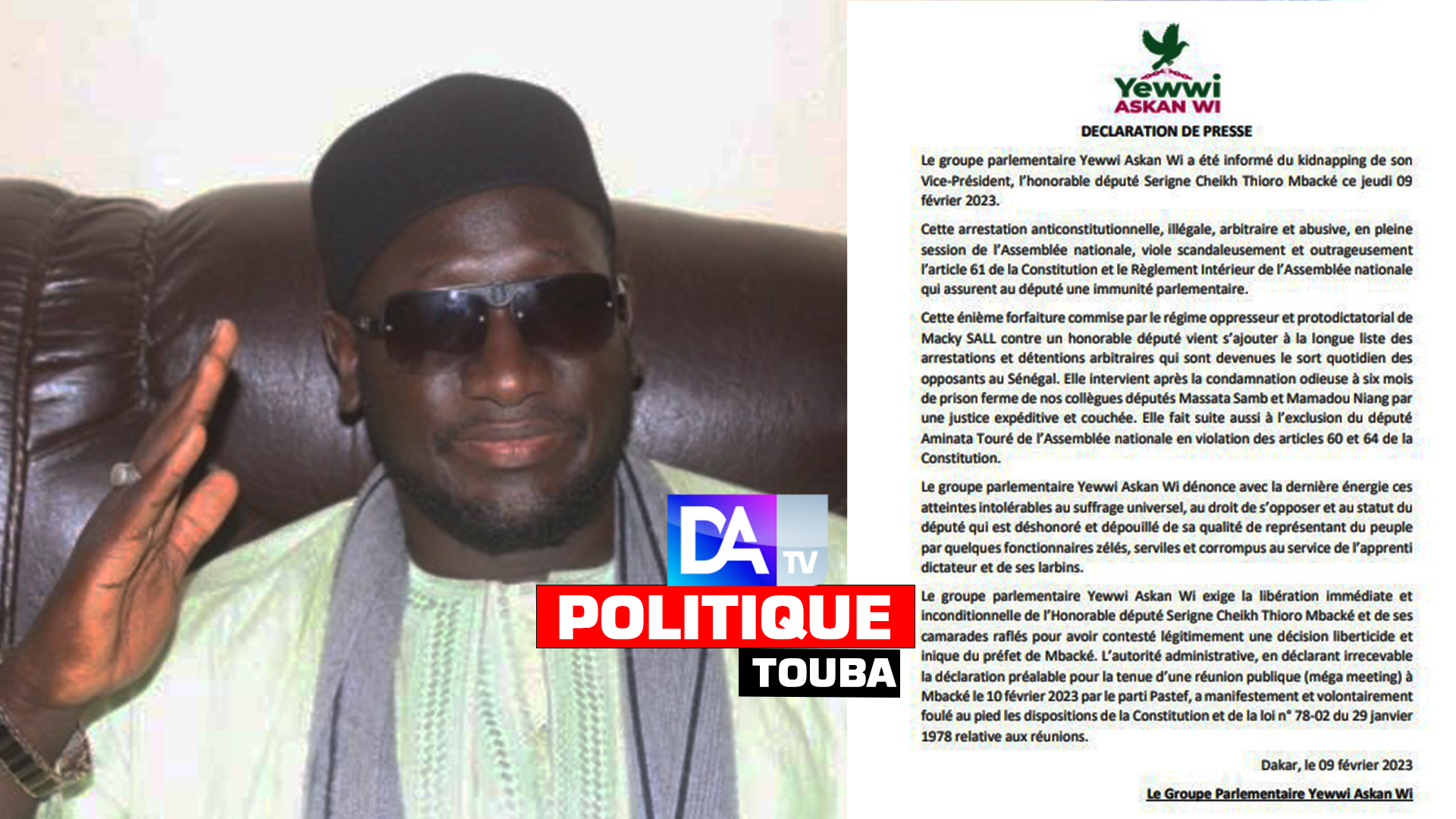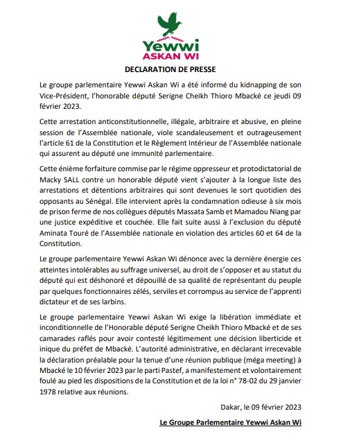 Pour conclure, la coalition de réclamer la libération du député et de ses amis. "Le groupe parlementaire de Yewwi Askan Wi exige la libération immédiate et inconditionnelle de l’Honorable député Serigne Cheikh Thioro Mbacké et de ses camarades raflés pour avoir contesté légitimement une décision liberticide et inique du préfet de Mbacké. L’autorité administrative, en déclarant irrecevable la déclaration préalable pour la tenue d’une réunion publique (méga meeting) à Mbacké le 10 février 2023 par le parti Pastef, a manifestement et volontairement foulé au pied les dispositions de la Constitution et de la loi n° 78-02 du 29 janvier 1978 relative aux réunions".