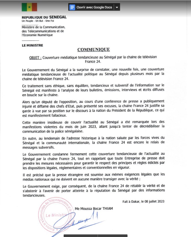 Dans un communiqué transmis à Dakaractu, le gouvernement exprime " sa surprise de constater une couverture médiatique tendancieuse de l'actualité politique au Sénégal depuis plusieurs mois par la chaîne de télévision France 24".