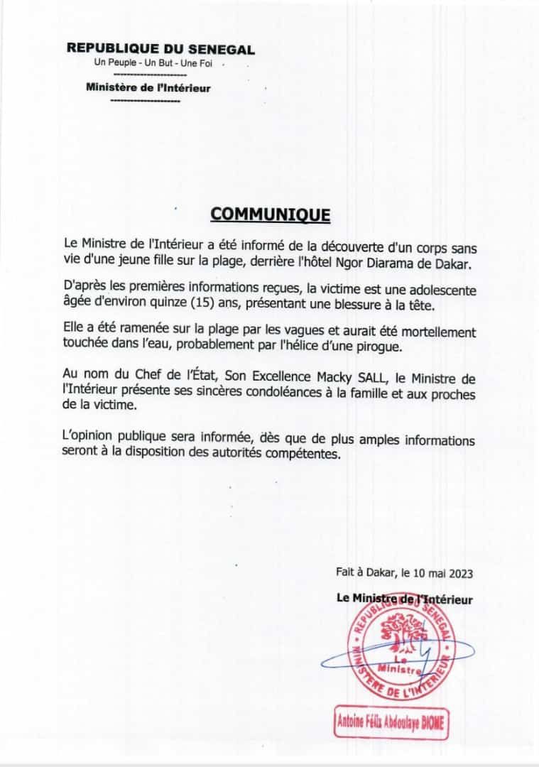 Prenant le soin de parcourir ledit communiqué, le ministère de l'intérieur après avoir constaté les faits a ajouté ceci. " D'après les premières informations reçues, la victime est une adolescente agée d'environ 15 ans, présentant une blessure à la tête. Elle a été ramenée sur la plage par les vagues et aurait été mortellement touchée dans l'eau, probablement par l'hélice d'une pirogue".