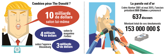 Les époux Clinton ont eux aussi un goût prononcé pour l’argent, mais ils l’assument moins ouvertement. On se souvient que Bernie Sanders, l’adversaire de Hillary lors de la primaire démocrate, avait vertement dénoncé les sommes astronomiques – 200 000 dollars, en moyenne – exigées par sa rivale pour une conférence à titre privé.