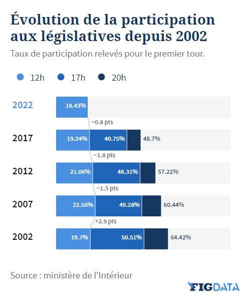 Elle est aussi en nette baisse par rapport au premier tour de la présidentielle 2022, où elle atteignait 25,48% à midi. Elle est également inférieure à celle des élections législatives de 2012 à la même heure (21,06%).