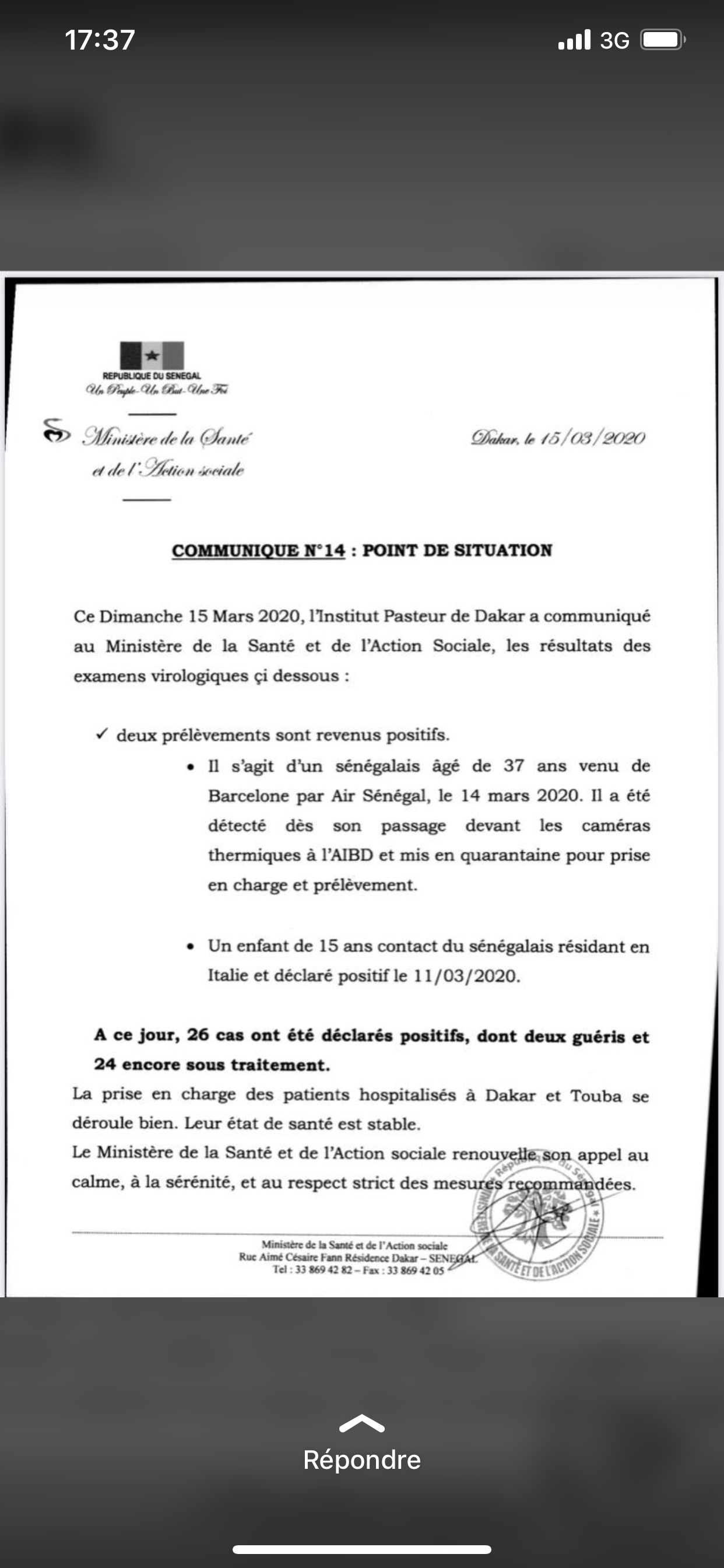 Deux nouveaux cas ont été testés positifs au coronavirus ce dimanche. Il s’agit d’un sénégalais de 37 ans revenu de Barcelone (Espagne) par Air Sénégal du 14 mars 2020 et un enfant de 15 ans en contact avec le « Modou-Modou » de Touba.