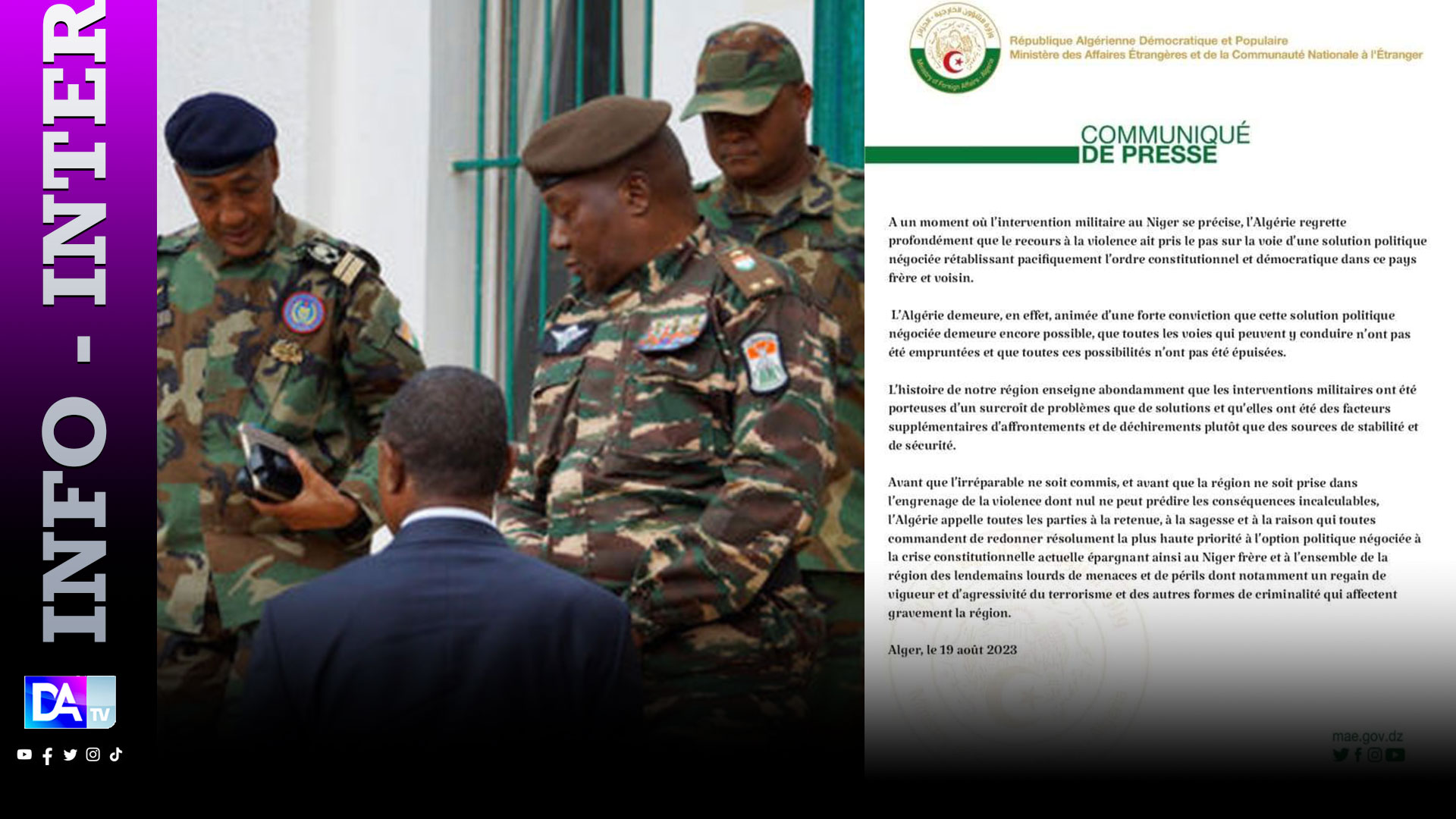 À l'instar de certains pays, l'Algérie préconise la voie pacifique pour venir à bout du conflit au Niger. Dans un communiqué lu à Dakaractu, la République Algérienne démocratique et populaire dit regretter "profondément que le recours à la violence ait pris le pas sur la voie d'une solution politique négociée rétablissant pacifiquement l'ordre constitutionnel et démocratique dans ce pays frère et voisin".