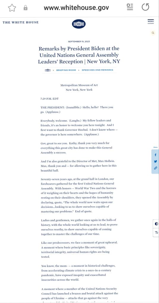 Le président de la République du Sénégal devait aussi honorer de sa présence l’invitation du gouvernement Américain qui, chaque année, à cette période où se tient ce grand rendez-vous international, organise une réception à l'honneur des dirigeants présents durant l'AG de L'ONU . Le Président Américain Joe Biden a organisé cette réception le mardi 19 septembre 2023 à 19h 30 (7:29 P.M New York ) au Musée métropolitain d'art de New York. D’ailleurs, devant les chefs d’Etat présents, Biden ce jour là, a tenu un discours dont nous détenons un extrait (Voir Lien ).