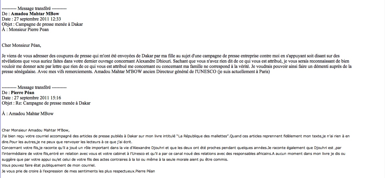 Voila pourquoi Mbow a anticipé et a eu l'échange électronique qui suit avec Pierre Péan.