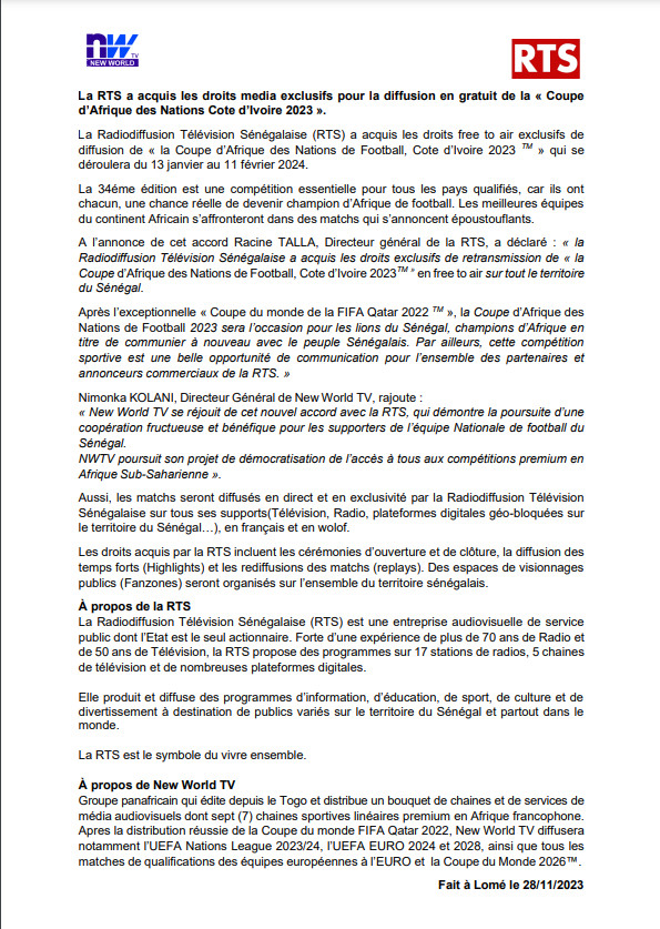 New World TV se réjouit de cet nouvel accord avec la RTS, qui démontre la poursuite d'une coopération fructueuse et bénéfique pour les supporters de l'équipe Nationale de football du Sénégal.