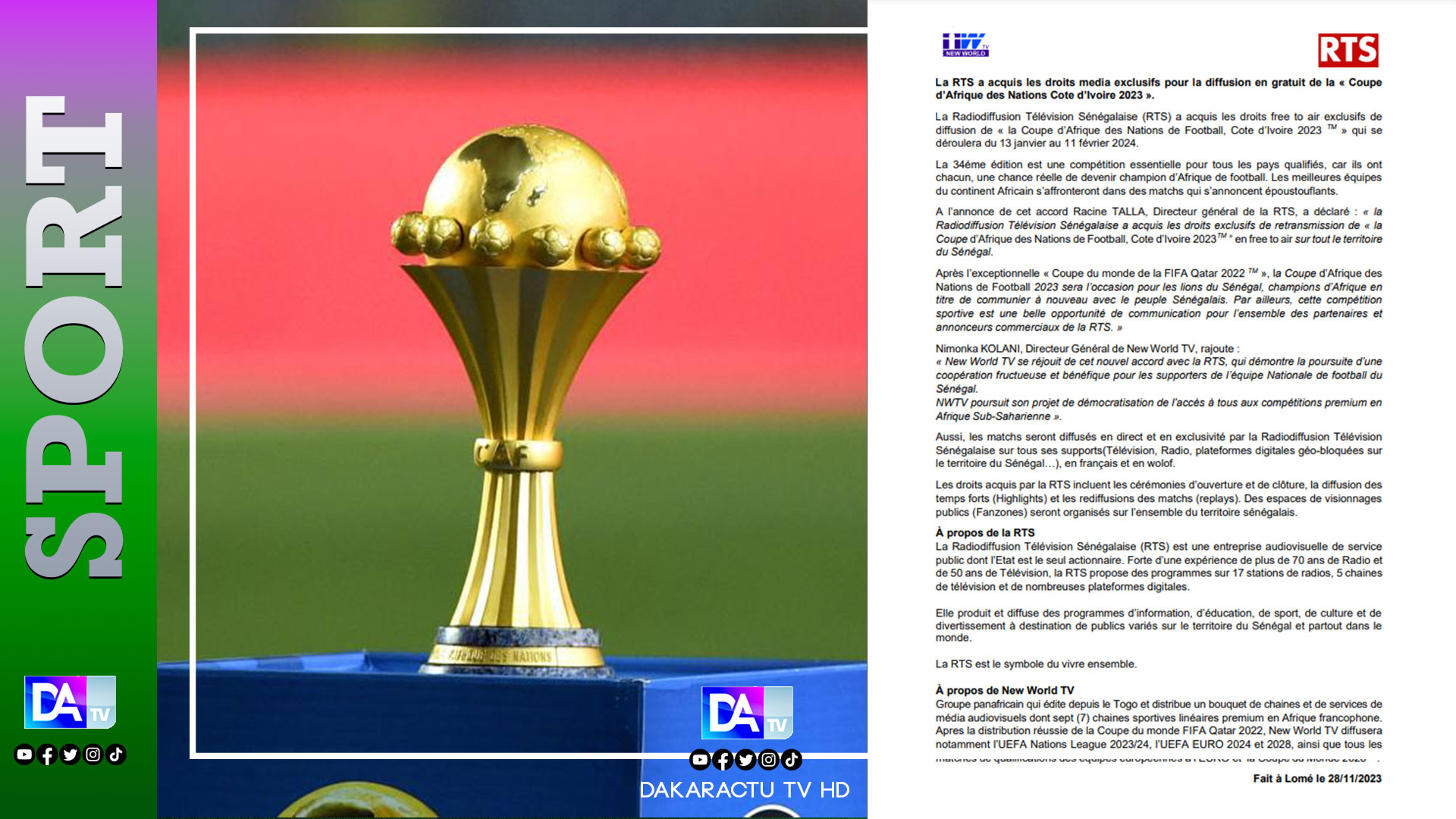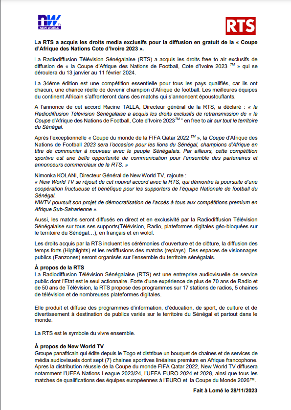 La Radiodiffusion Télévision Sénégalaise (RTS) a acquis les droits free to air exclusifs de diffusion de la Coupe d'Afrique des Nations de Football, Cote d'Ivoire 2023™ qui se déroulera du 13 janvier au 11 février 2024.
