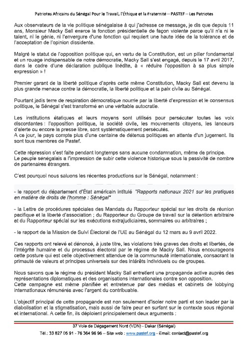 Les partenaires du Sénégal doivent s’abstenir de tout soutien au projet destructeur du président Macky Sall dont la motivation principale est la peur des lendemains de sa gestion calamiteuse, clanique et violente, émaillée de corruption, de détournements et de crimes impunis.