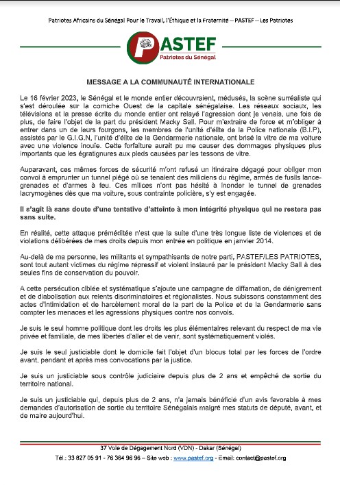 Au-delà de ma personne, les militants et sympathisants de notre parti, PASTEF/LES PATRIOTES, sont tout autant victimes du régime répressif et violent instauré par le président Macky Sall à des seules fins de conservation du pouvoir.