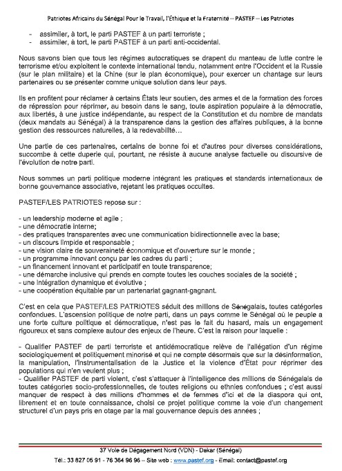- Qualifier PASTEF de parti anarchiste, c’est aussi insulter et manquer de respect à ces nombreux partenaires nationaux, étrangers et internationaux qui échangent, travaillent et partagent avec notre formation autour des enjeux pluriels du moment et de l’Afrique.