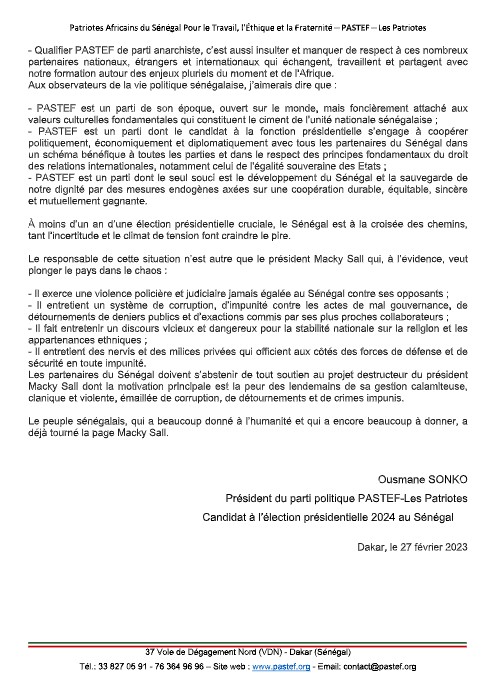 - PASTEF est un parti dont le candidat à la fonction présidentielle s’engage à coopérer politiquement, économiquement et diplomatiquement avec tous les partenaires du Sénégal dans un schéma bénéfique à toutes les parties et dans le respect des principes fondamentaux du droit des relations internationales, notamment celui de l'égalité souveraine des Etats ;