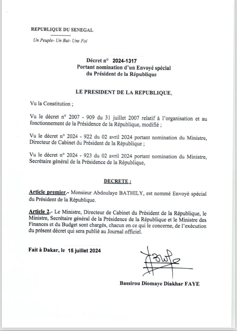 Le président de la République du Sénégal a enfin sorti le décret de nomination de son Envoyé spécial. Il s’agit du professeur Abdoulaye Bathily. Le chef de l’État, Bassirou Diomaye Faye, invite le ministre, Directeur de Cabinet du Président de la République, le Ministre, Secrétaire général de la Présidence de la République et le Ministre des Finances et du Budget, chacun en ce qui le concerne, de l'exécution du présent décret qui sera publié au Journal officiel.