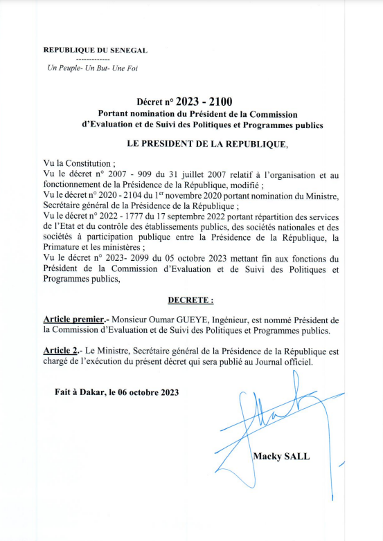 L’ancien maire de sangalkam et ancien ministre des collectivités territoriales du développement et de l’aménagement des territoires vient d’être nommé Président de la Commission d'Evaluation et de Suivi des Politiques et Programmes publics (CESPPP). Ce dernier a pour mission d’nformer sur les programmes et politiques publiques de l’Etat du Sénégal ; Recueillir les avis des citoyens sur les programmes et politiques publiques ; Permettre l’évaluation des services publics par les usagers et la population; Permettre des échanges d’experts dés la conception des programmes et politiques; Permettre l’évaluation des programmes et politiques publics de l’Etat du Sénégal; Proposer un tableau de bord récapitulatif de l’ensemble des évaluations des services, programmes et politiques publics de l’Etat du Sénégal.
