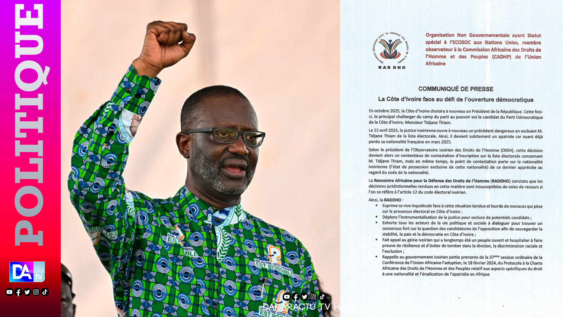 La RADDHO a souligné une décision judiciaire du 22 avril 2025, qu'elle qualifie de "précédent dangereux", concernant l'exclusion de Tidjane Thiam de la liste électorale. Cette décision intervient après la perte de sa nationalité française en mars 2025, le rendant ainsi apatride selon l'organisation.