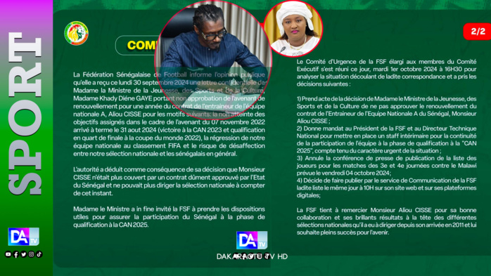 La Fédération Sénégalaise de Football informe l'opinion publique qu'elle a reçu ce lundi 30 septembre 2024 une lettre confidentielle de Madame la Ministre de la Jeunesse, des Sports et de la Culture, Madame Khady Diéne GAYE portant non approbation de l'avenant de renouvellement pour une année du contrat de l'entraineur de l'équipe nationale A, Aliou CISSE pour les motifs suivants: la non atteinte des objectifs assignés dans le cadre de l'avenant du 07 novembre 2022 arrivé à terme le 31 aout 2024 (victoire à la CAN 2023 et qualification en quart de finale à la coupe du monde 2022), la régression de notre équipe nationale au classement FIFA et le risque de désaffection entre notre sélection nationale et les sénégalais en général.