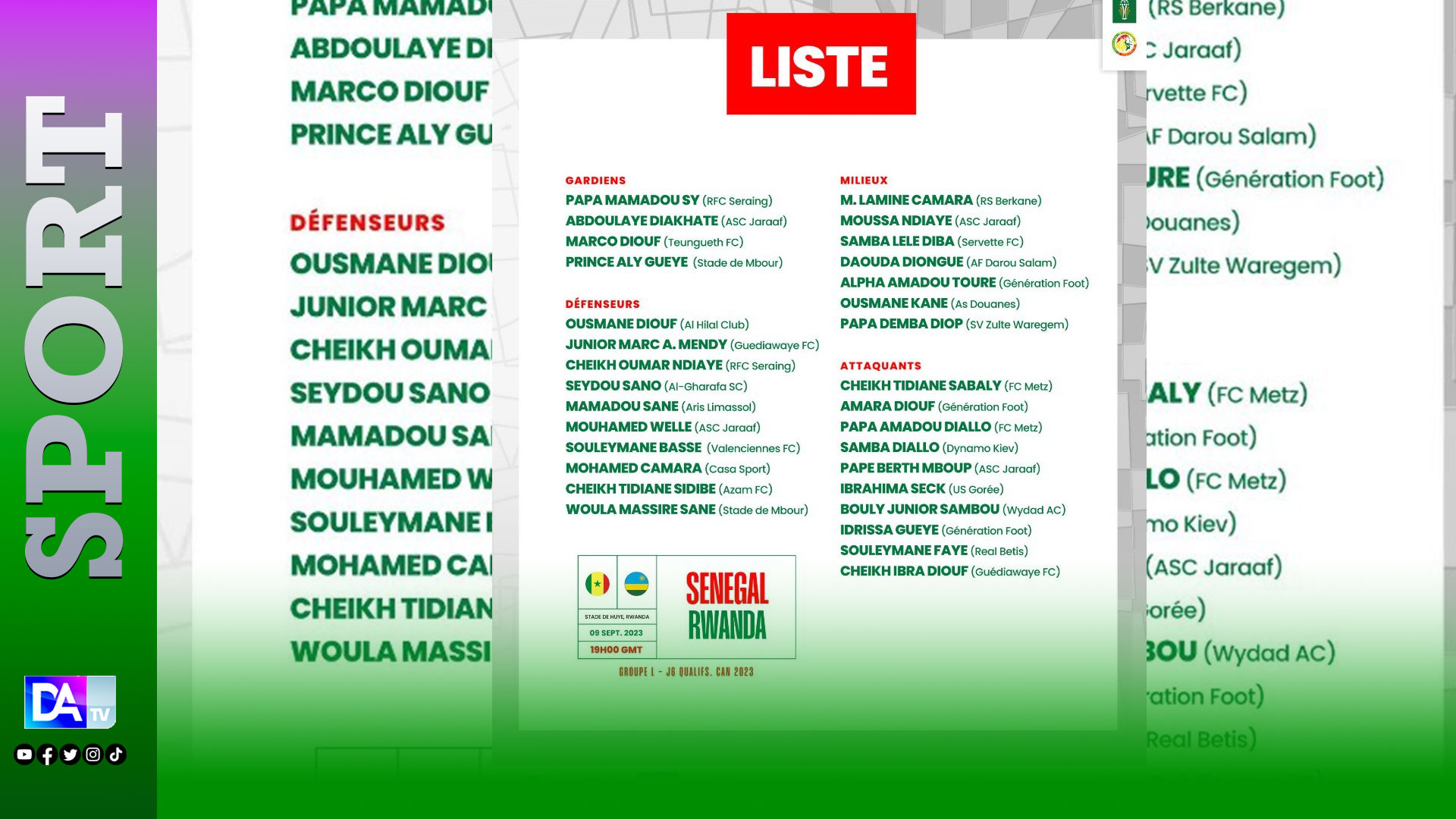 Le sélectionneur de l’équipe nationale U20, Malick Daf et son collègue Pape Thiaw de la sélection locale, viennent de publier une liste de 31 joueurs devant prendre part au match Rwanda vs Sénégal prévu le 9 septembre à Kigali pour le compte de la 6ème journée des éliminatoires de la CAN 2024. Il s’agit d’une sélection B qui est essentiellement composée par des champions d’Afrique U20 en titre, mais également par la majeure partie des joueurs qui ont remporté le dernier CHAN en Algérie.