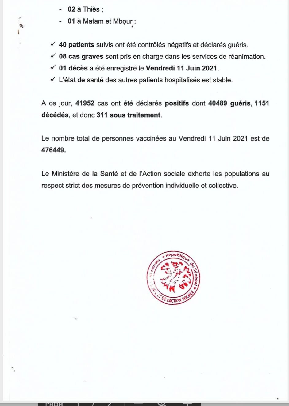 A ce jour, le Sénégal compte 41952cas positifs dont 40489 guéris, 1151 décès et 311 patients encore sous traitement.