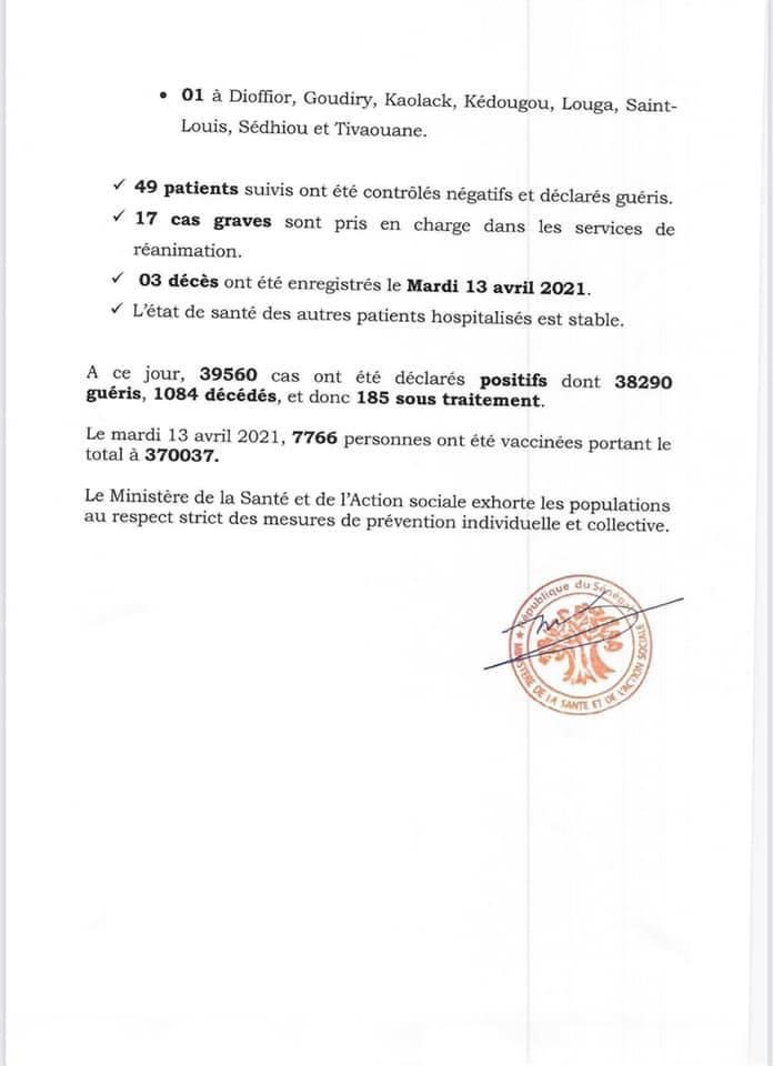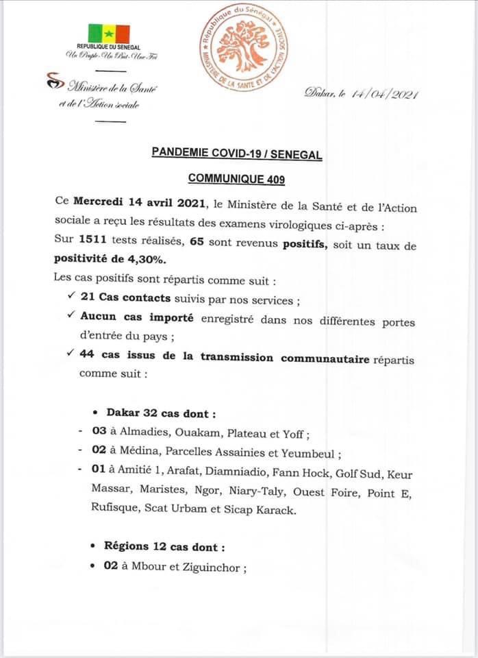 A ce jour, le Sénégal compte 39560 cas positifs dont 38290 guéris, 1084 décès et 185 encore sous traitement.