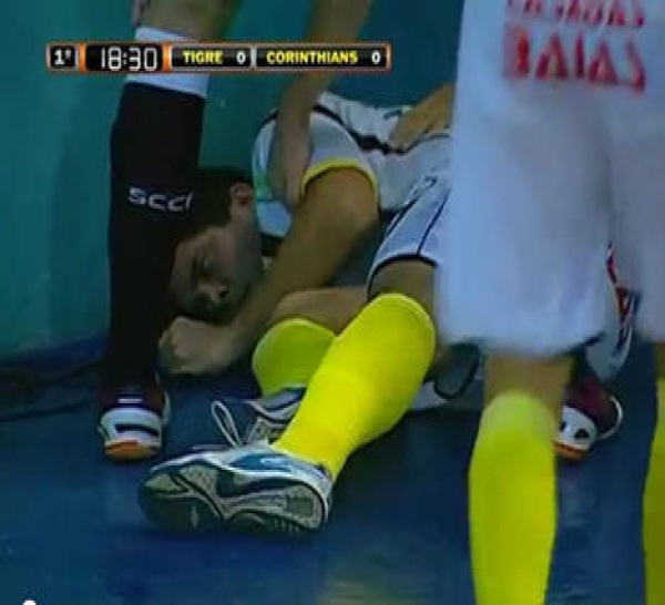 Tigre vs Corinthians, match de futsal en coupe du Brésil. Capacete, joueur de Tigre, est lancé en profondeur par l'un de ses coéquipiers. Emporté par son élan, il heurte un mur de plein fouet avec sa...