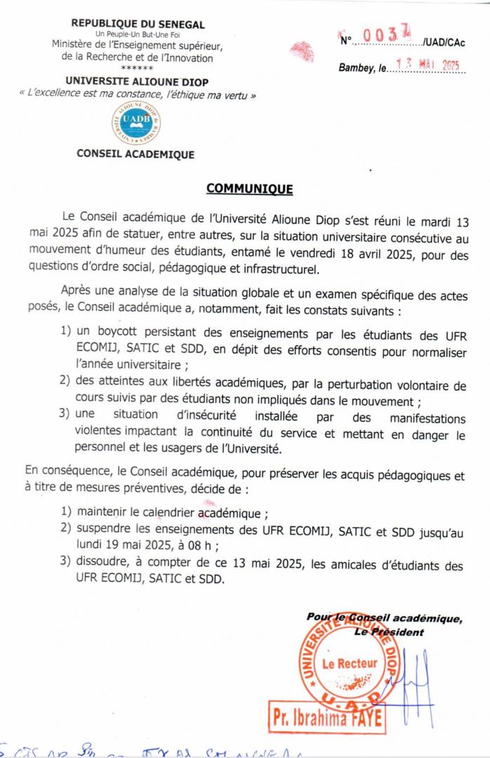 Dans un communiqué parvenu à Dakaractu, le Recteur de l’UADB, Pr. Ibrahima Faye, annonce que le Conseil académique de l’Université Alioune Diop (UADB) s’est réuni le mardi 13 mai 2025 pour statuer sur la crise universitaire consécutive au mouvement d’humeur étudiant démarré le 18 avril 2025, lié à des revendications sociales, pédagogiques et infrastructurelles.