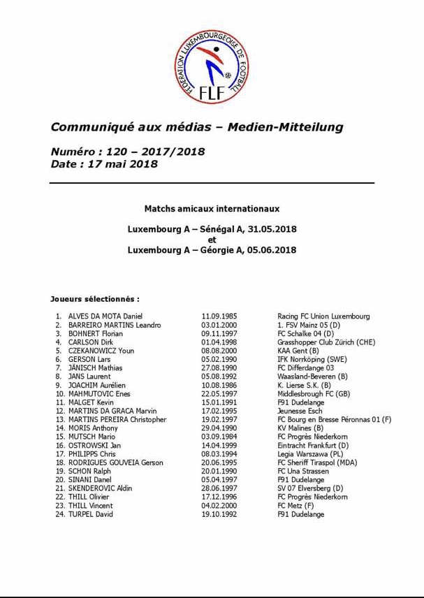 Voici la liste de 24 joueurs Luxembourgeois convoqués pour les matchs amicaux contre le Sénégal et la Géorgie
